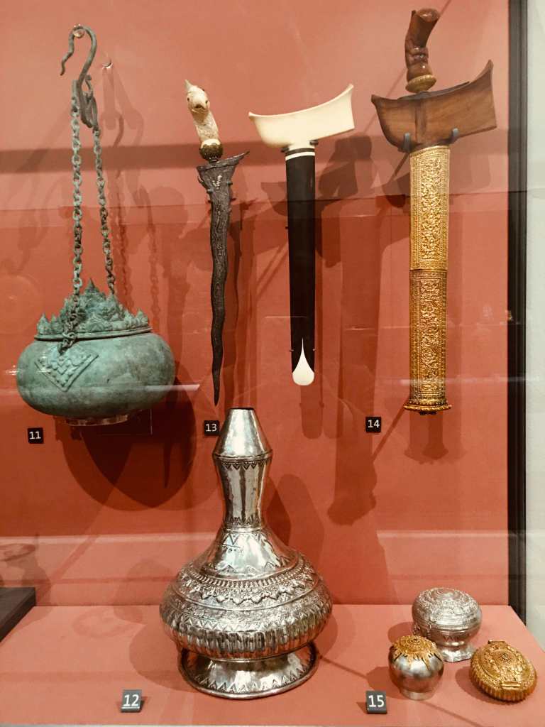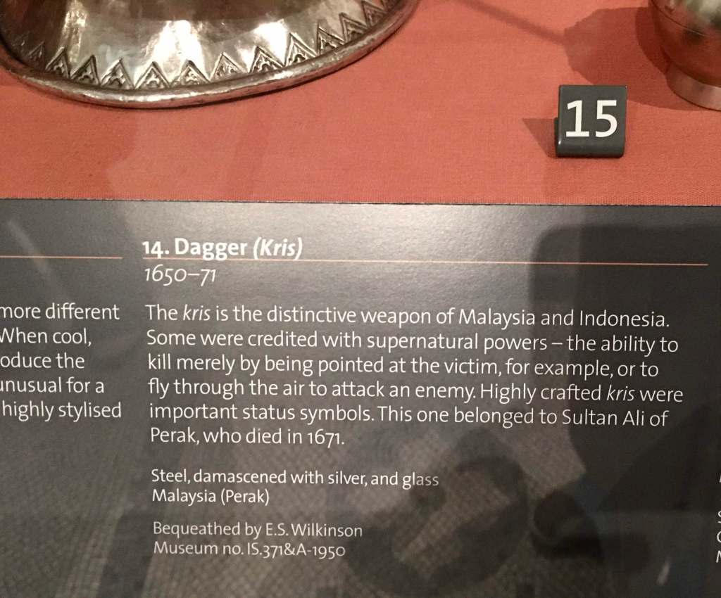But The Night of the Flying Blades is inspired by an actual description card of a keris still on display at the V&A Museum in South Kensington. Go to the Southeast Asia section and you’ll find a wavy dagger with an ivory parrot hilt. The card underneath it says:
