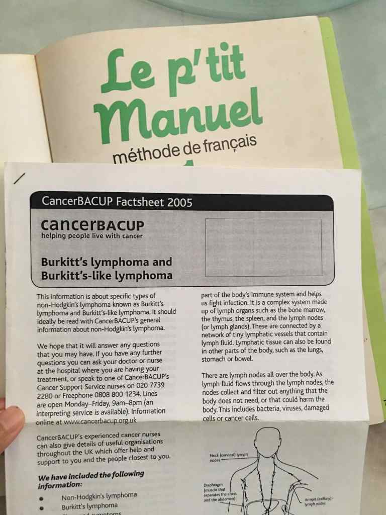 The other book that belonged to my brother was Le p’tit Manuel: Methode de Francais 1, published by Hachette (1983). It was my brother’s French textbook. But get this: within the pages, I found the UK NHS’s CancerBACUP Factsheet 2005 on Burkitt’s Lymphoma. My sister, who lived with me in the UK, brought this back to Malaysia for my brother when he was diagnosed with cancer.